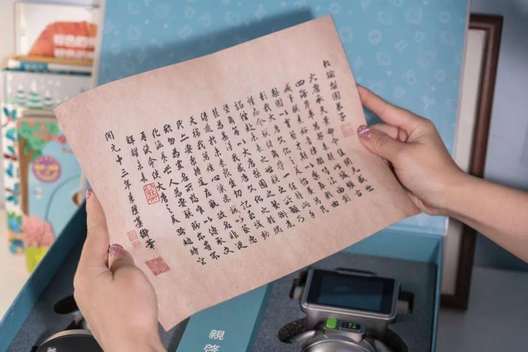 礼盒内含2 台 AI 机器人、3万算力卡、一封临摹李隆基字体手诏,满满仪式感,包装高档有面,无论是给自家孩子用,还是送给亲友的孩子,都超有份量~