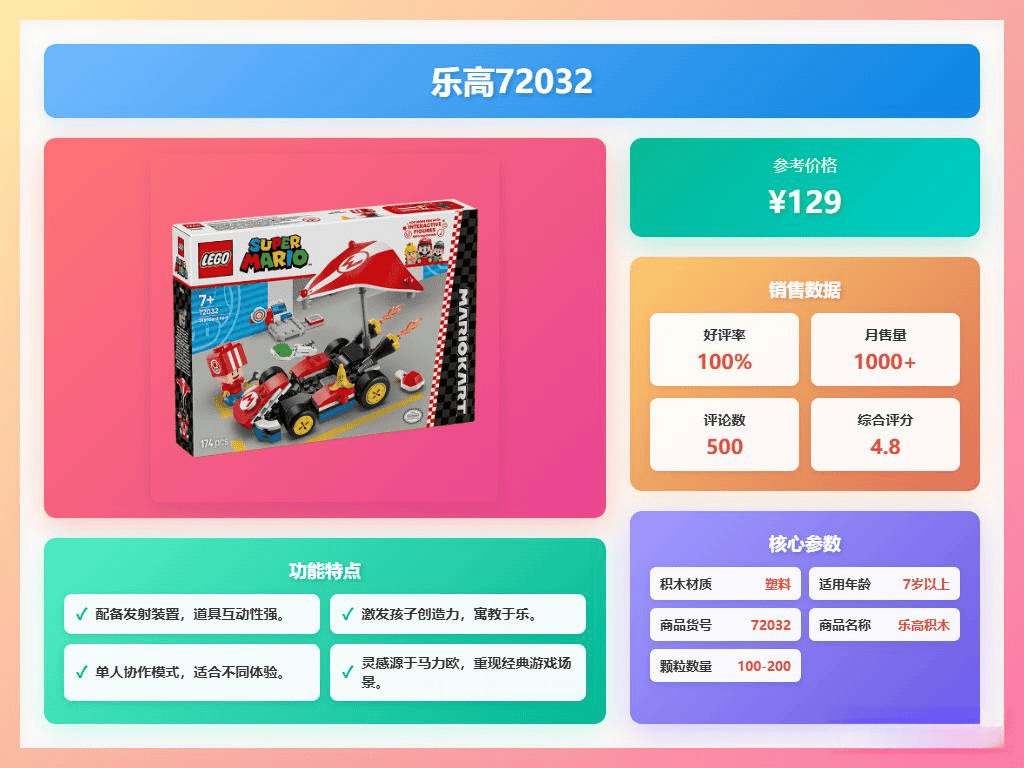 当然,除了情怀和互动性,还得考虑耐玩度。别买那种华而不实,玩两天就坏的。乐高在这方面做得不错,质量有保证,而且很多套装都支持多人合作和创意拼搭,比如乐高72045,可以单人创意拼搭,也能和朋友一起挑战,还能结合APP获得拼装灵感。再说了,丰富的动作体验也很重要!像发射龟壳、漂移、滑翔这些经典动作,加上声音和视觉效果,玩起来才过瘾!还有乐高72032,卡丁车造型酷炫,滑翔翼可拆卸,还有发射装置,这些小细节都能增加趣味性。